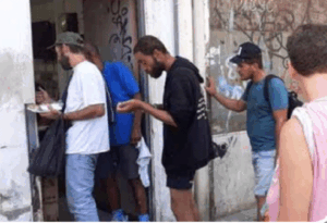 Homeless men enter a “free café” sponsored by our partner. Single men are particularly vulnerable because they are low priority to receive accommodation assistance.