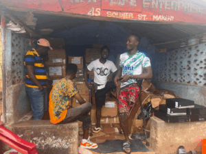Some members of an amputees’ soccer team take a break from loading the container contents into their local warehouse before further distribution.