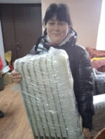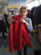 Providing warmth is an essential aim of anyone helping displaced people, and residents are shown here with items from the previous shipment.
